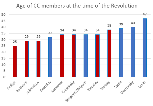 PS1. Some time ago I out together this graph to illustrate the relative youth of Central Committee members at the time of Revolution. The median age was 34. The youngest member was 25. But I also illustrated that more than half of the members of the Central Committee in 1917 (in red) were killed by Stalin. Others died before he could kill them.